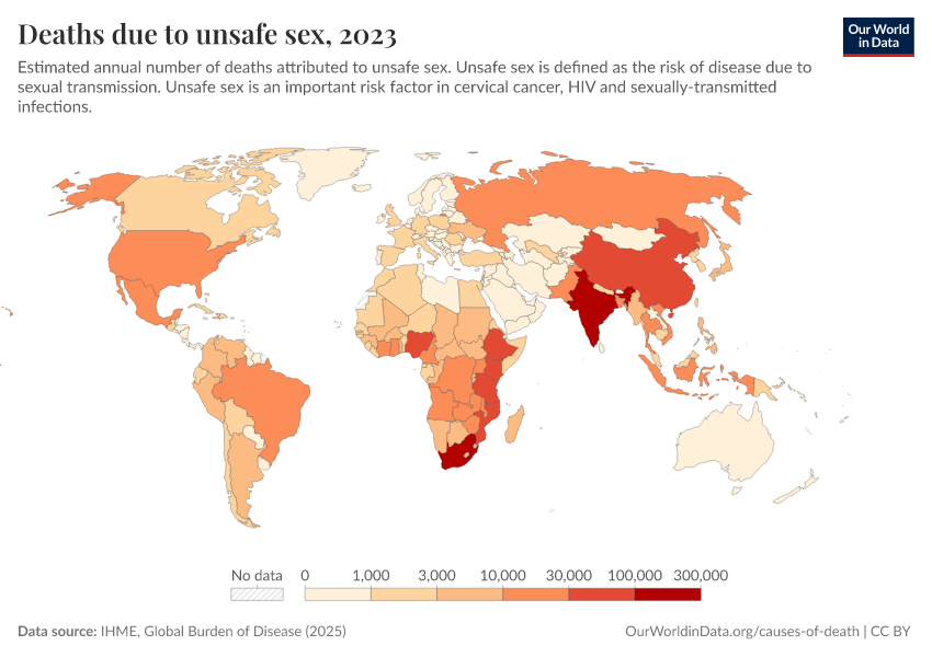 “Data Page: Deaths due to unsafe sex”, part of the following publication: Esteban Ortiz-Ospina and Max Roser (2016) - “Global Health”. Data adapted from IHME, Global Burden of Disease. Retrieved from https://pop-growth-BCE.owid.pages.dev:8789/20260107-153017/grapher/deaths-due-to-unsafe-sex.html [online resource] (archived on January 7, 2026).How to cite this data