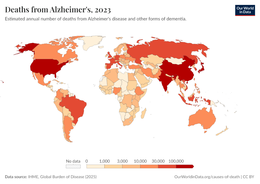 “Data Page: Deaths from Alzheimer's”, part of the following publication: Esteban Ortiz-Ospina and Max Roser (2016) - “Global Health”. Data adapted from IHME, Global Burden of Disease. Retrieved from https://pop-growth-BCE.owid.pages.dev:8789/20250909-093708/grapher/deaths-from-alzheimers.html [online resource] (archived on September 9, 2025).How to cite this data