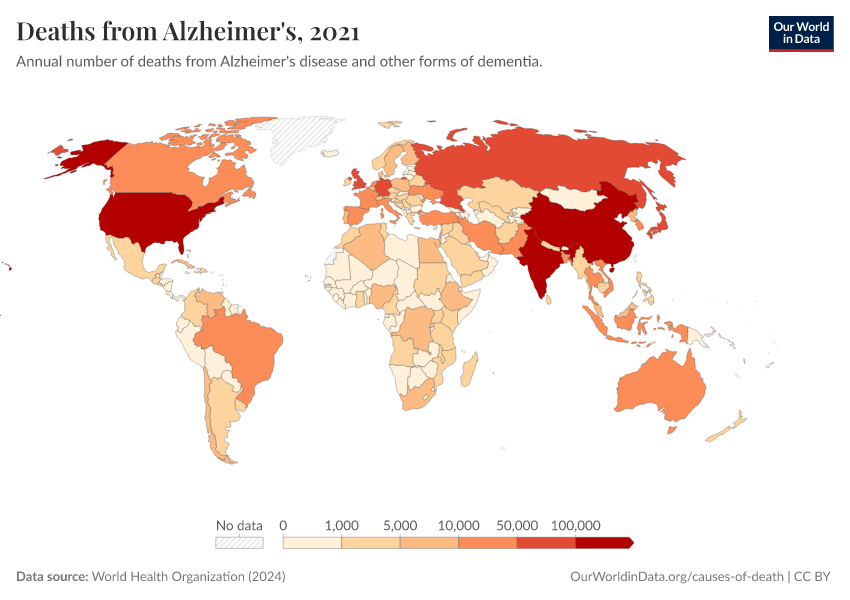 World Health Organization (2024) – with major processing by Our World in Data. “Deaths from Alzheimer's” [dataset]. World Health Organization, “Global Health Estimates” [original data]. Retrieved February 12, 2026 from https://pop-growth-BCE.owid.pages.dev:8789/20250909-093708/grapher/deaths-from-alzheimers-other-dementias.html (archived on September 9, 2025).