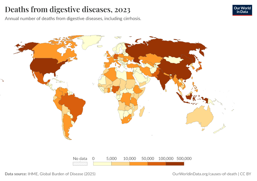IHME, Global Burden of Disease (2024) – with minor processing by Our World in Data. “Deaths from digestive diseases” [dataset]. IHME, Global Burden of Disease, “Global Burden of Disease - Deaths and DALYs” [original data]. Retrieved February 12, 2026 from https://pop-growth-BCE.owid.pages.dev:8789/20250909-093708/grapher/deaths-from-digestive-diseases.html (archived on September 9, 2025).