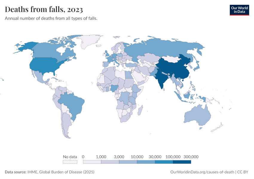 “Data Page: Deaths from falls”, part of the following publication: Esteban Ortiz-Ospina and Max Roser (2016) - “Global Health”. Data adapted from IHME, Global Burden of Disease. Retrieved from https://pop-growth-BCE.owid.pages.dev:8789/20250909-093708/grapher/deaths-from-falls-gbd.html [online resource] (archived on September 9, 2025).How to cite this data