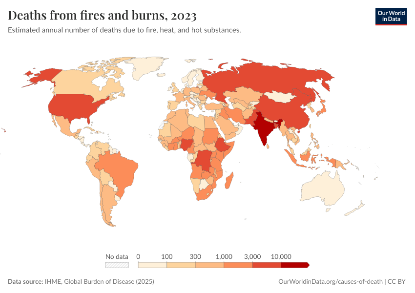 “Data Page: Deaths from fires and burns”, part of the following publication: Esteban Ortiz-Ospina and Max Roser (2016) - “Global Health”. Data adapted from IHME, Global Burden of Disease. Retrieved from https://pop-growth-BCE.owid.pages.dev:8789/20250909-093708/grapher/deaths-from-fires-and-burns.html [online resource] (archived on September 9, 2025).How to cite this data
