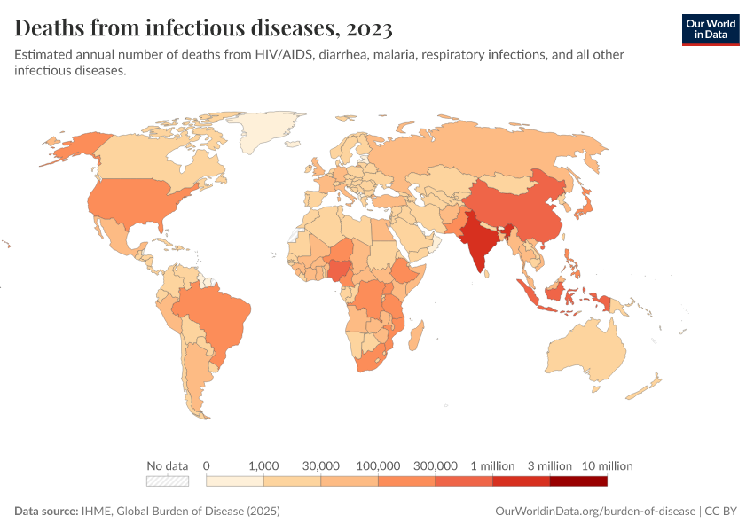 “Data Page: Deaths from infectious diseases”, part of the following publication: Esteban Ortiz-Ospina and Max Roser (2016) - “Global Health”. Data adapted from IHME, Global Burden of Disease. Retrieved from https://pop-growth-BCE.owid.pages.dev:8789/20250909-093708/grapher/deaths-from-infectious-diseases.html [online resource] (archived on September 9, 2025).How to cite this data