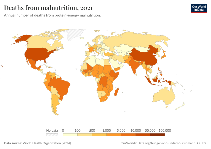 World Health Organization (2024) – with major processing by Our World in Data. “Deaths from malnutrition” [dataset]. World Health Organization, “Global Health Estimates” [original data]. Retrieved February 12, 2026 from https://pop-growth-BCE.owid.pages.dev:8789/20250909-093708/grapher/deaths-from-malnutrition-ghe.html (archived on September 9, 2025).