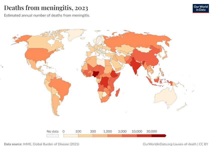“Data Page: Deaths from meningitis”, part of the following publication: Esteban Ortiz-Ospina and Max Roser (2016) - “Global Health”. Data adapted from IHME, Global Burden of Disease. Retrieved from https://pop-growth-BCE.owid.pages.dev:8789/20250909-093708/grapher/deaths-from-meningitis.html [online resource] (archived on September 9, 2025).How to cite this data