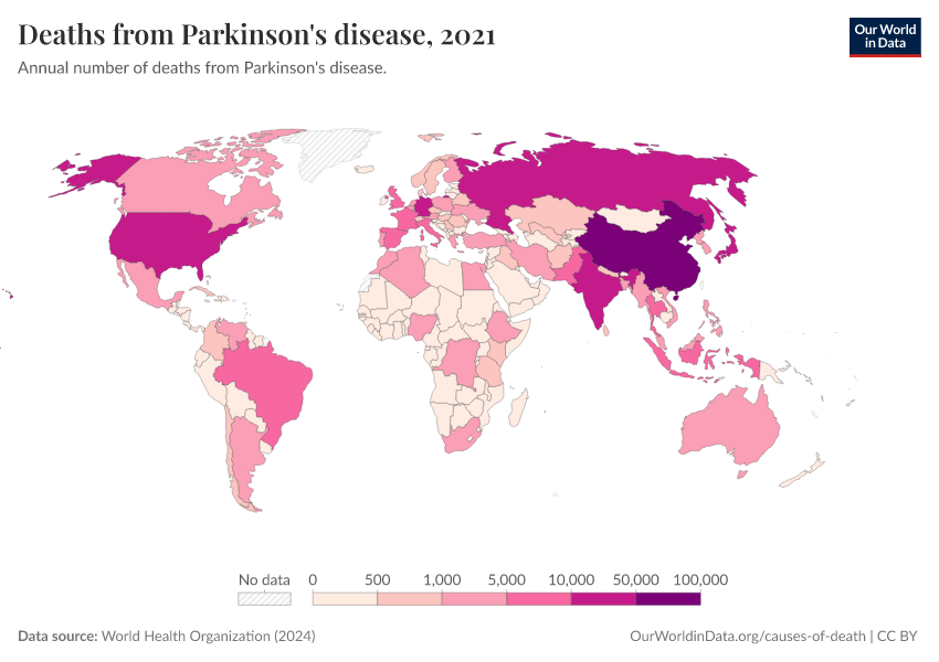 World Health Organization (2024) – with major processing by Our World in Data. “Deaths from Parkinson's disease” [dataset]. World Health Organization, “Global Health Estimates” [original data]. Retrieved February 12, 2026 from https://pop-growth-BCE.owid.pages.dev:8789/20250909-093708/grapher/deaths-from-parkinsons-disease-ghe.html (archived on September 9, 2025).