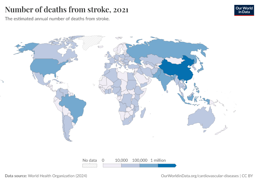 World Health Organization (2024) – with major processing by Our World in Data. “Number of deaths from stroke” [dataset]. World Health Organization, “Global Health Estimates” [original data]. Retrieved February 12, 2026 from https://pop-growth-BCE.owid.pages.dev:8789/20250909-093708/grapher/deaths-from-strokes-ghe.html (archived on September 9, 2025).