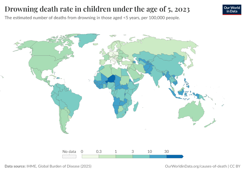 IHME, Global Burden of Disease (2024) – with minor processing by Our World in Data. “Drowning death rate in children under the age of 5” [dataset]. IHME, Global Burden of Disease, “Global Burden of Disease - Deaths and DALYs” [original data]. Retrieved February 12, 2026 from https://pop-growth-BCE.owid.pages.dev:8789/20250909-093708/grapher/drowning-death-rates-under-5.html (archived on September 9, 2025).