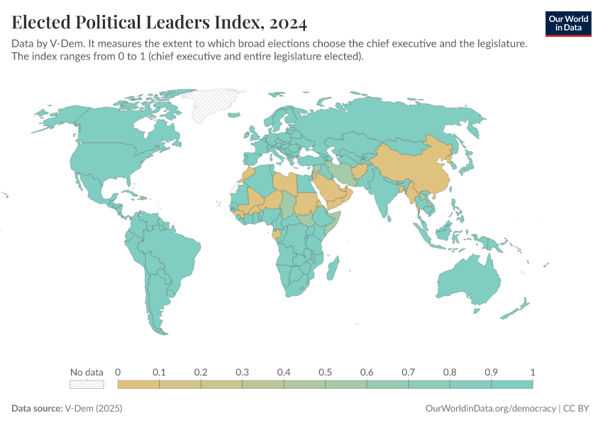 “Data Page: Elected officials index”, part of the following publication: Bastian Herre, Lucas Rodés-Guirao, and Esteban Ortiz-Ospina (2013) - “Democracy”. Data adapted from V-Dem. Retrieved from https://pop-growth-BCE.owid.pages.dev:8789/20260119-070102/grapher/elected-political-leaders-index.html [online resource] (archived on January 19, 2026).How to cite this data