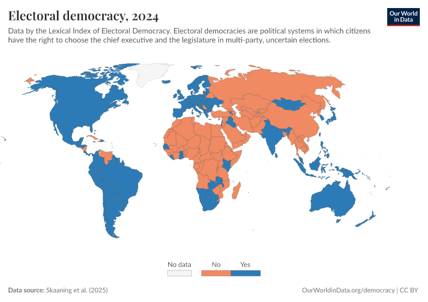 “Data Page: Electoral democracy”, part of the following publication: Bastian Herre, Lucas Rodés-Guirao, and Esteban Ortiz-Ospina (2013) - “Democracy”. Data adapted from Skaaning et al.. Retrieved from https://pop-growth-BCE.owid.pages.dev:8789/20260119-065148/grapher/electoral-democracy-lexical.html [online resource] (archived on January 19, 2026).How to cite this data