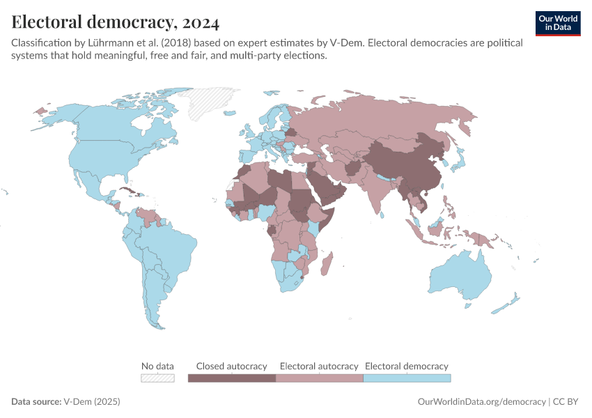 “Data Page: Political regime”, part of the following publication: Bastian Herre, Lucas Rodés-Guirao, and Esteban Ortiz-Ospina (2013) - “Democracy”. Data adapted from V-Dem. Retrieved from https://pop-growth-BCE.owid.pages.dev:8789/20260119-070102/grapher/electoral-democracy-row.html [online resource] (archived on January 19, 2026).How to cite this data