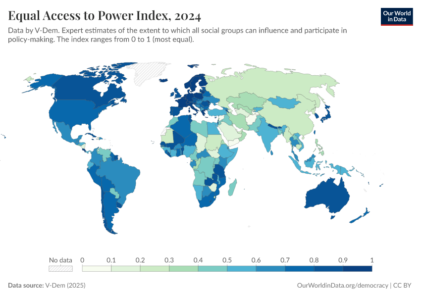 “Data Page: Equal access to power index”, part of the following publication: Bastian Herre, Lucas Rodés-Guirao, and Esteban Ortiz-Ospina (2013) - “Democracy”. Data adapted from V-Dem. Retrieved from https://pop-growth-BCE.owid.pages.dev:8789/20260119-070102/grapher/equal-access-to-power-index.html [online resource] (archived on January 19, 2026).How to cite this data