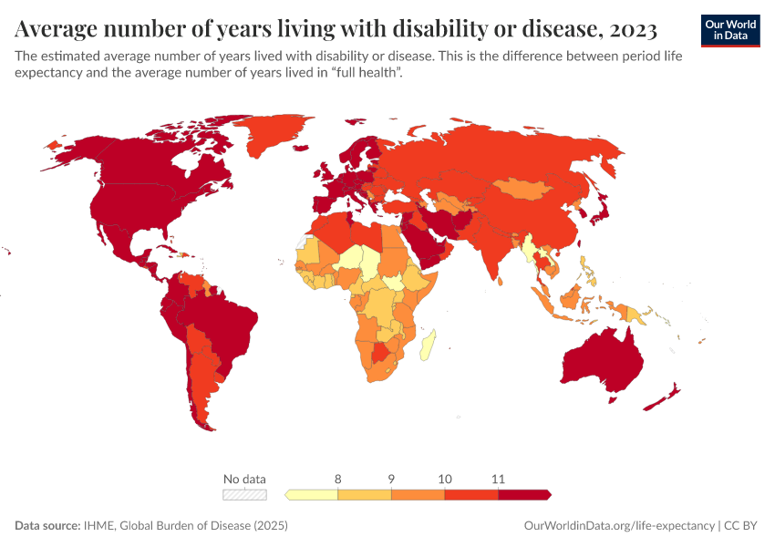 “Data Page: Average number of years living with disability or disease”, part of the following publication: Saloni Dattani, Lucas Rodés-Guirao, Hannah Ritchie, Esteban Ortiz-Ospina, and Max Roser (2023) - “Life Expectancy”. Data adapted from IHME, Global Burden of Disease. Retrieved from https://pop-growth-BCE.owid.pages.dev:8789/20250909-093708/grapher/expected-years-of-living-with-disability-or-disease-burden.html [online resource] (archived on September 9, 2025).How to cite this data