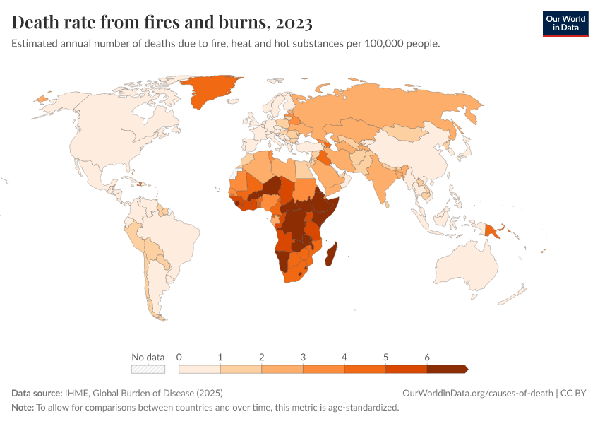 IHME, Global Burden of Disease (2024) – with minor processing by Our World in Data. “Death rate from fires and burns” [dataset]. IHME, Global Burden of Disease, “Global Burden of Disease - Deaths and DALYs” [original data]. Retrieved February 12, 2026 from https://pop-growth-BCE.owid.pages.dev:8789/20250909-093708/grapher/fire-death-rates.html (archived on September 9, 2025).