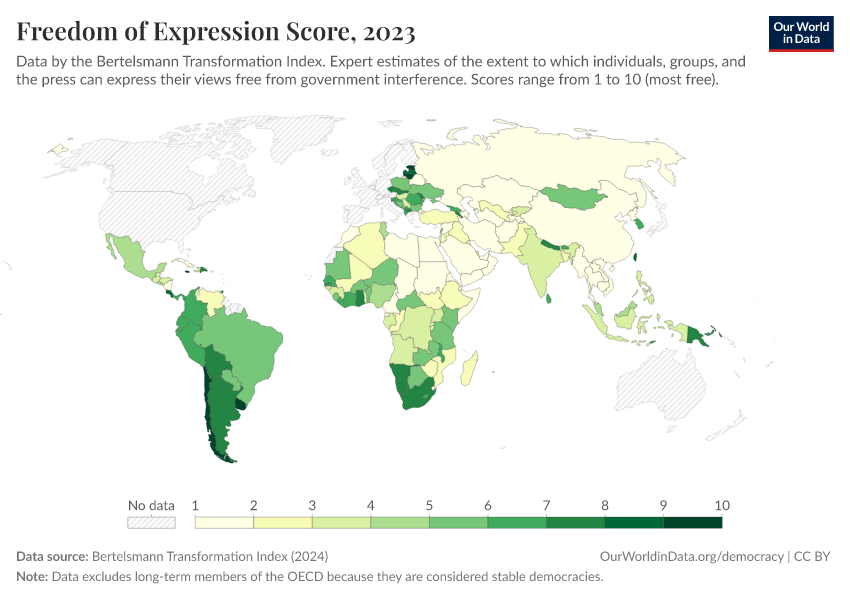 “Data Page: Freedom of expression score”, part of the following publication: Bastian Herre, Lucas Rodés-Guirao, and Esteban Ortiz-Ospina (2013) - “Democracy”. Data adapted from Bertelsmann Transformation Index. Retrieved from https://pop-growth-BCE.owid.pages.dev:8789/20260105-133053/grapher/freedom-of-expression-score-bti.html [online resource] (archived on January 5, 2026).How to cite this data