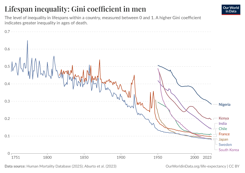 “Data Page: Lifespan inequality: Gini coefficient in men”, part of the following publication: Saloni Dattani, Lucas Rodés-Guirao, Hannah Ritchie, Esteban Ortiz-Ospina, and Max Roser (2023) - “Life Expectancy”. Data adapted from Human Mortality Database, United Nations. Retrieved from https://pop-growth-BCE.owid.pages.dev:8789/20251022-222946/grapher/gini-coefficient-of-lifespan-inequality-in-males.html [online resource] (archived on October 22, 2025).How to cite this data