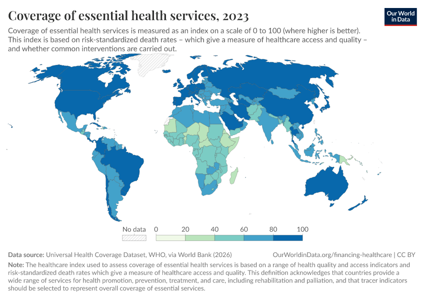 “Data Page: Coverage of essential health services”. Our World in Data (2026). Data adapted from World Health Organization (WHO) Global Health Observatory, via World Bank. Retrieved from https://pop-growth-BCE.owid.pages.dev:8789/20260112-111535/grapher/healthcare-access-quality-un.html [online resource] (archived on January 12, 2026).How to cite this data