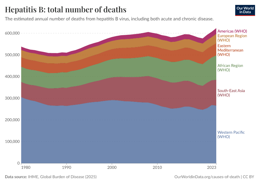 IHME, Global Burden of Disease (2024) – with minor processing by Our World in Data. “Hepatitis B: total number of deaths” [dataset]. IHME, Global Burden of Disease, “Global Burden of Disease - Deaths and DALYs” [original data]. Retrieved February 12, 2026 from https://pop-growth-BCE.owid.pages.dev:8789/20250909-093708/grapher/hepatitis-b-number-of-deaths.html (archived on September 9, 2025).