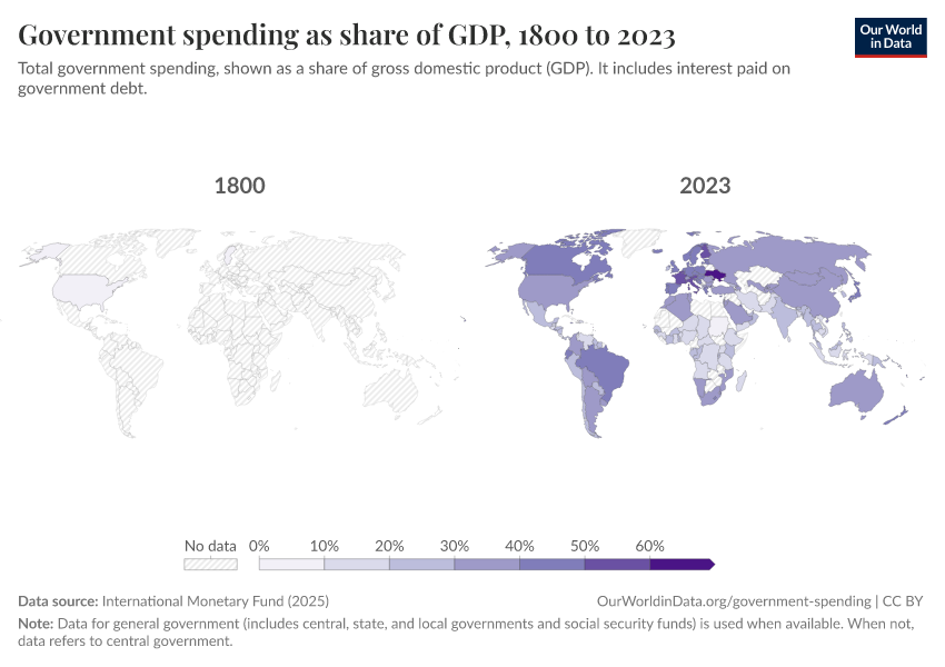 “Data Page: Government spending as share of GDP”, part of the following publication: Esteban Ortiz-Ospina, Bertha Rohenkohl, Pablo Arriagada, and Max Roser (2016) - “Government Spending”. Data adapted from International Monetary Fund. Retrieved from https://pop-growth-BCE.owid.pages.dev:8789/20250909-093708/grapher/historical-gov-spending-gdp.html [online resource] (archived on September 9, 2025).How to cite this data