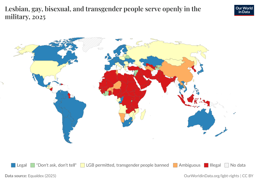 “Data Page: Lesbian, gay, bisexual, and transgender people serve openly in the military”, part of the following publication: Bastian Herre and Pablo Arriagada (2023) - “LGBT+ Rights”. Data adapted from Equaldex. Retrieved from https://pop-growth-BCE.owid.pages.dev:8789/20250909-093708/grapher/lgbt-military-equaldex.html [online resource] (archived on September 9, 2025).How to cite this data