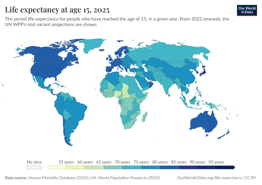 “Data Page: Life expectancy at 15”, part of the following publication: Saloni Dattani, Lucas Rodés-Guirao, Hannah Ritchie, Esteban Ortiz-Ospina, and Max Roser (2023) - “Life Expectancy”. Data adapted from Human Mortality Database, United Nations. Retrieved from https://pop-growth-BCE.owid.pages.dev:8789/20251022-222946/grapher/life-expectancy-at-age-15.html [online resource] (archived on October 22, 2025).How to cite this data
