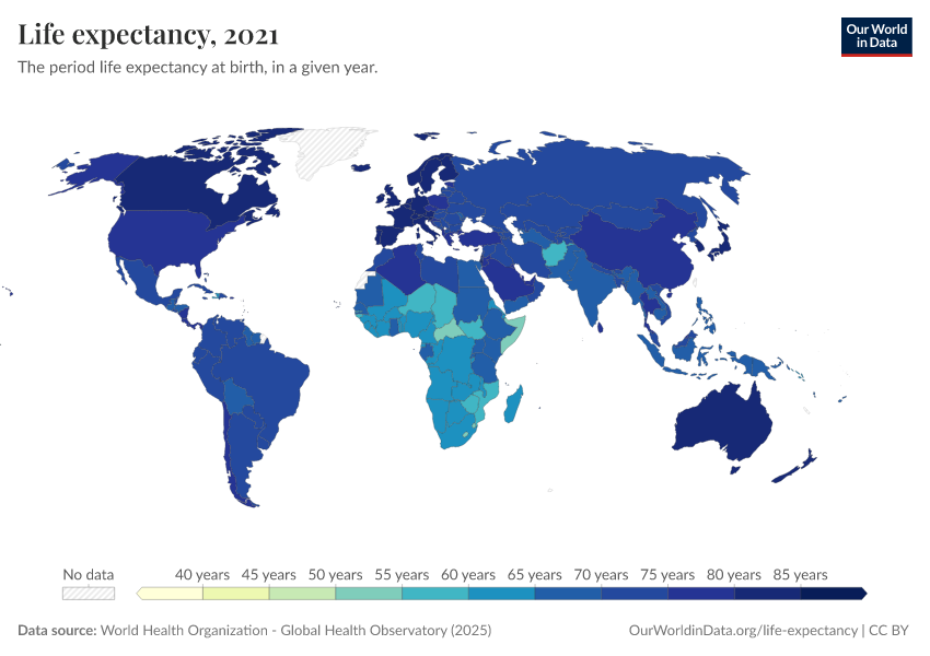 “Data Page: Life expectancy”. Our World in Data (2026). Data adapted from World Health Organization. Retrieved from https://pop-growth-BCE.owid.pages.dev:8789/20260119-070102/grapher/life-expectancy-at-birth-who-gho.html [online resource] (archived on January 19, 2026).How to cite this data
