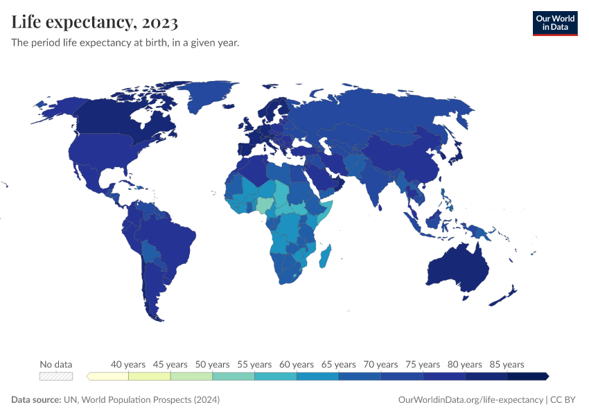 “Data Page: Life Expectancy, age 0”. Our World in Data (2026). Data adapted from United Nations. Retrieved from https://pop-growth-BCE.owid.pages.dev:8789/20250909-093708/grapher/life-expectancy-unwpp.html [online resource] (archived on September 9, 2025).How to cite this data