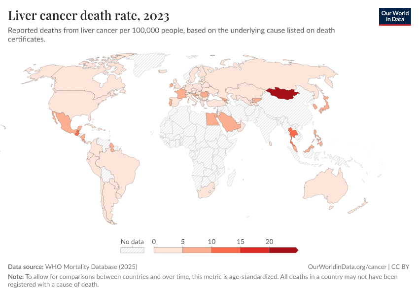 “Data Page: Liver cancer death rate”, part of the following publication: Saloni Dattani, Fiona Spooner, Hannah Ritchie, and Max Roser (2023) - “Causes of Death”. Data adapted from WHO Mortality Database. Retrieved from https://pop-growth-BCE.owid.pages.dev:8789/20250909-093708/grapher/liver-cancer-death-rate.html [online resource] (archived on September 9, 2025).How to cite this data