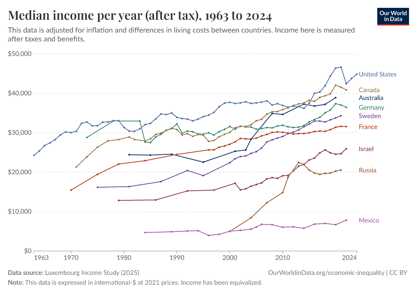 “Data Page: Median income per year (after tax)”, part of the following publication: Joe Hasell, Bertha Rohenkohl, Pablo Arriagada, Esteban Ortiz-Ospina, and Max Roser (2022) - “Poverty”. Data adapted from Luxembourg Income Study. Retrieved from https://pop-growth-BCE.owid.pages.dev:8789/20251224-105916/grapher/median-income-after-tax-lis.html [online resource] (archived on December 24, 2025).How to cite this data
