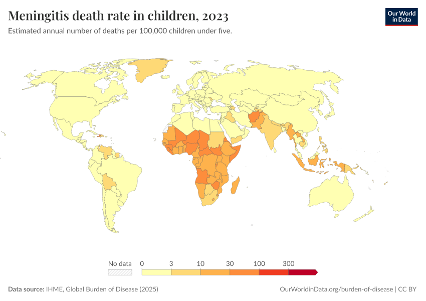 “Data Page: Meningitis death rate in children”, part of the following publication: Esteban Ortiz-Ospina and Max Roser (2016) - “Global Health”. Data adapted from IHME, Global Burden of Disease. Retrieved from https://pop-growth-BCE.owid.pages.dev:8789/20250909-093708/grapher/meningitis-death-rates-children-under-5.html [online resource] (archived on September 9, 2025).How to cite this data
