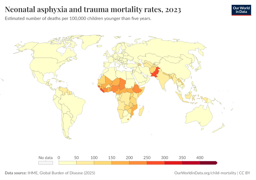 IHME, Global Burden of Disease (2024) – with minor processing by Our World in Data. “Neonatal asphyxia and trauma mortality rates” [dataset]. IHME, Global Burden of Disease, “Global Burden of Disease - Deaths and DALYs” [original data]. Retrieved February 12, 2026 from https://pop-growth-BCE.owid.pages.dev:8789/20250909-093708/grapher/mortality-neonatal-asphyxia-and-trauma.html (archived on September 9, 2025).