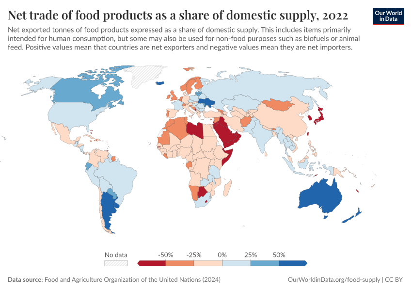 “Data Page: Net trade of food products as a share of domestic supply”, part of the following publication: Hannah Ritchie, Pablo Rosado, and Max Roser (2023) - “Agricultural Production”. Data adapted from Food and Agriculture Organization of the United Nations. Retrieved from https://pop-growth-BCE.owid.pages.dev:8789/20260116-144923/grapher/net-food-trade-as-a-share-of-domestic-supply.html [online resource] (archived on January 16, 2026).How to cite this data