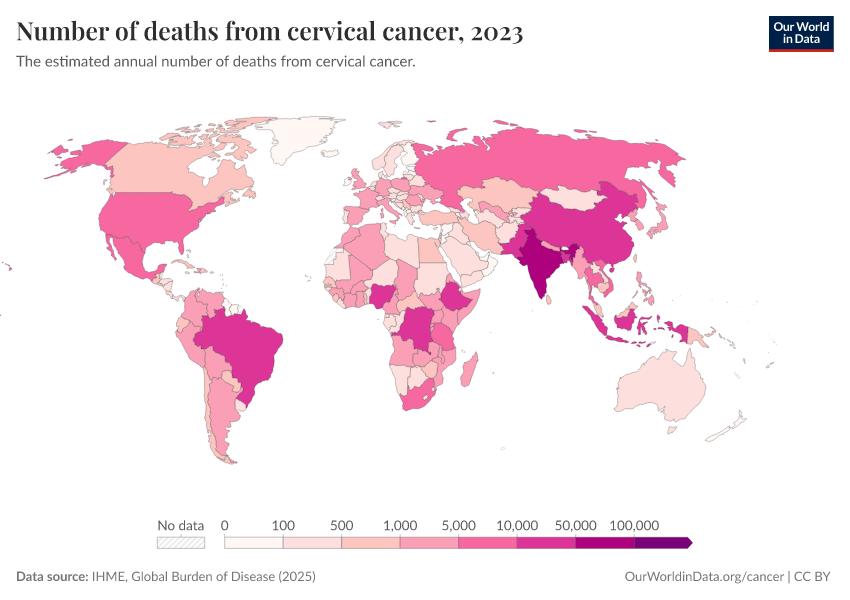 “Data Page: Number of deaths from cervical cancer”, part of the following publication: Esteban Ortiz-Ospina and Max Roser (2016) - “Global Health”. Data adapted from IHME, Global Burden of Disease. Retrieved from https://pop-growth-BCE.owid.pages.dev:8789/20250909-093708/grapher/number-of-deaths-from-cervical-cancer.html [online resource] (archived on September 9, 2025).How to cite this data