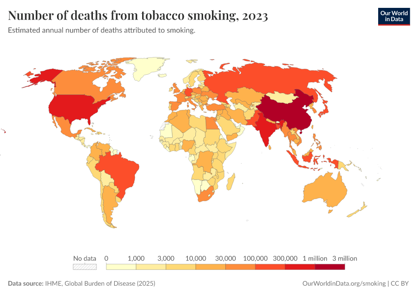 “Data Page: Number of deaths from tobacco smoking”, part of the following publication: Esteban Ortiz-Ospina and Max Roser (2016) - “Global Health”. Data adapted from IHME, Global Burden of Disease. Retrieved from https://pop-growth-BCE.owid.pages.dev:8789/20250909-093708/grapher/number-of-deaths-from-tobacco-smoking.html [online resource] (archived on September 9, 2025).How to cite this data