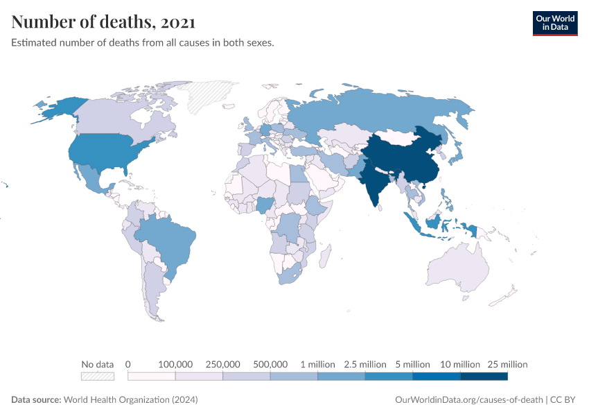 “Data Page: Number of deaths”, part of the following publication: Esteban Ortiz-Ospina and Max Roser (2016) - “Global Health”. Data adapted from World Health Organization. Retrieved from https://pop-growth-BCE.owid.pages.dev:8789/20250909-093708/grapher/number-of-deaths-who.html [online resource] (archived on September 9, 2025).How to cite this data