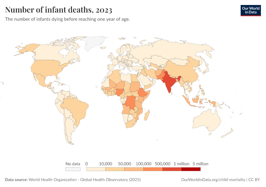 “Data Page: Number of infant deaths”. Our World in Data (2026). Data adapted from World Health Organization. Retrieved from https://pop-growth-BCE.owid.pages.dev:8789/20260119-070102/grapher/number-of-infant-deaths-gho.html [online resource] (archived on January 19, 2026).How to cite this data