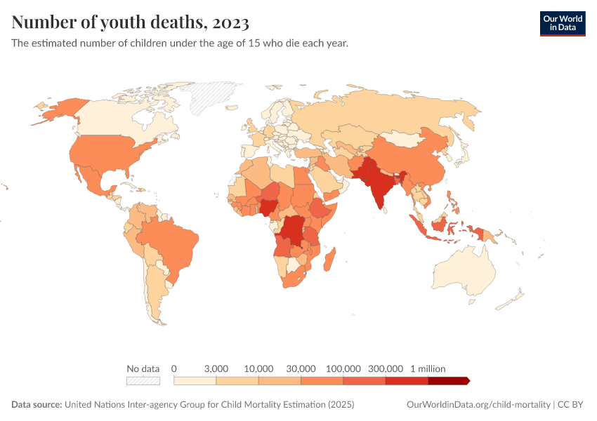 “Data Page: Under-fifteen deaths”, part of the following publication: Saloni Dattani, Fiona Spooner, Hannah Ritchie, and Max Roser (2023) - “Child and Infant Mortality”. Data adapted from United Nations Inter-agency Group for Child Mortality Estimation, UN Inter-agency Group for Child Mortality Estimation, Various sources. Retrieved from https://pop-growth-BCE.owid.pages.dev:8789/20260119-070102/grapher/number-of-youth-deaths.html [online resource] (archived on January 19, 2026).How to cite this data