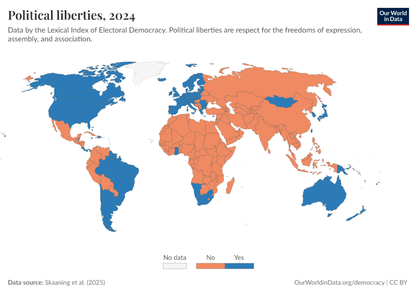 “Data Page: Political liberties”, part of the following publication: Bastian Herre, Lucas Rodés-Guirao, and Esteban Ortiz-Ospina (2013) - “Democracy”. Data adapted from Skaaning et al.. Retrieved from https://pop-growth-BCE.owid.pages.dev:8789/20260119-065148/grapher/political-liberties-lexical.html [online resource] (archived on January 19, 2026).How to cite this data