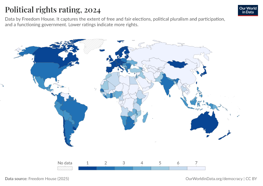 Freedom House (2025) – processed by Our World in Data. “Political rights rating” [dataset]. Freedom House, “Freedom in the World” [original data]. Retrieved February 12, 2026 from https://pop-growth-BCE.owid.pages.dev:8789/20260119-070102/grapher/political-rights-rating-fh.html (archived on January 19, 2026).