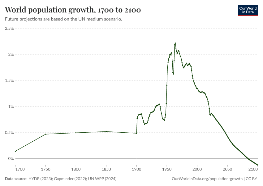 “Data Page: World population growth”, part of the following publication: Hannah Ritchie, Lucas Rodés-Guirao, Edouard Mathieu, Marcel Gerber, Esteban Ortiz-Ospina, Joe Hasell, and Max Roser (2023) - “Population Growth”. Data adapted from PBL Netherlands Environmental Assessment Agency, Gapminder, United Nations. Retrieved from https://pop-growth-BCE.owid.pages.dev:8789/20260119-065148/grapher/population-growth-rate.html [online resource] (archived on January 19, 2026).How to cite this data