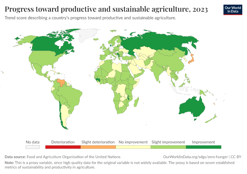 “Data Page: Progress toward productive and sustainable agriculture”. Our World in Data (2026). Data adapted from Food and Agriculture Organization of the United Nations. Retrieved from https://pop-growth-BCE.owid.pages.dev:8789/20260130-180113/grapher/progress-toward-productive-and-sustainable-agriculture.html [online resource] (archived on January 30, 2026).How to cite this data