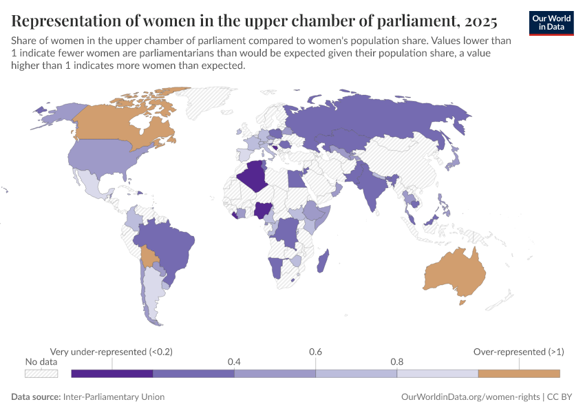 “Data Page: Representation of women in the upper chamber of parliament”. Our World in Data (2026). Data adapted from Inter-Parliamentary Union. Retrieved from https://pop-growth-BCE.owid.pages.dev:8789/20260130-180113/grapher/representation-of-women-in-the-upper-chamber-of-parliament.html [online resource] (archived on January 30, 2026).How to cite this data