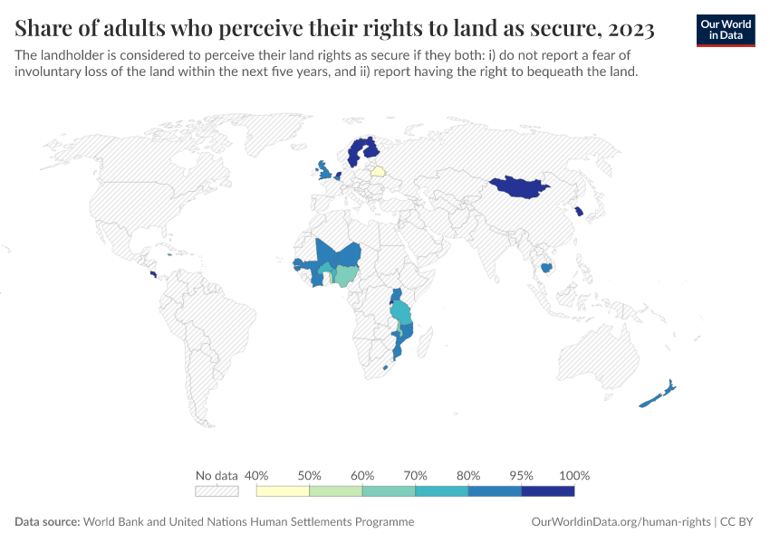 “Data Page: Share of adults who perceive their rights to land as secure”. Our World in Data (2026). Data adapted from World Bank and United Nations Human Settlements Programme. Retrieved from https://pop-growth-BCE.owid.pages.dev:8789/20251121-151713/grapher/share-of-adults-who-perceive-their-rights-to-land-as-secure.html [online resource] (archived on November 21, 2025).How to cite this data