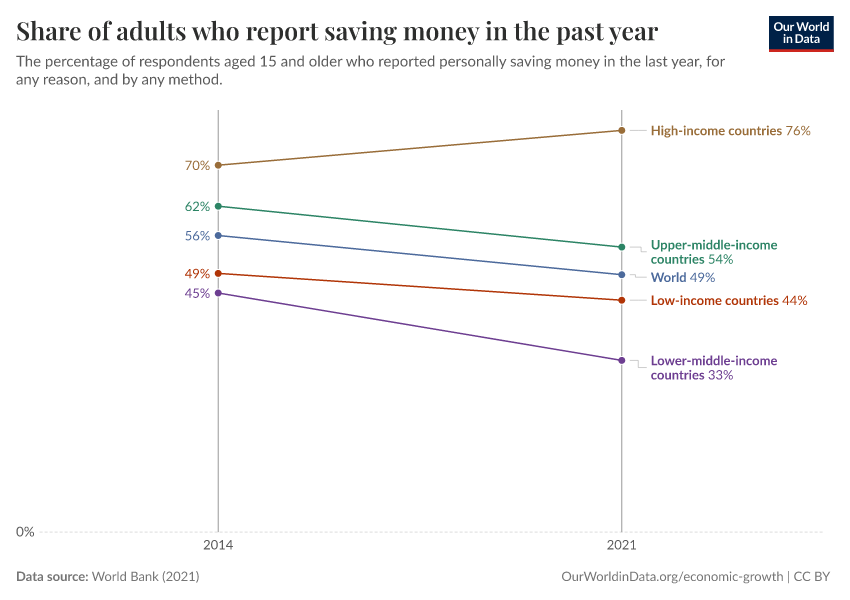 “Data Page: Share of adults who report saving money in the past year”, part of the following publication: Max Roser, Bertha Rohenkohl, Pablo Arriagada, Joe Hasell, Hannah Ritchie, and Esteban Ortiz-Ospina (2023) - “Economic Growth”. Data adapted from World Bank. Retrieved from https://pop-growth-BCE.owid.pages.dev:8789/20250909-093708/grapher/share-of-adults-who-report-saving-money-in-the-past-year.html [online resource] (archived on September 9, 2025).How to cite this data