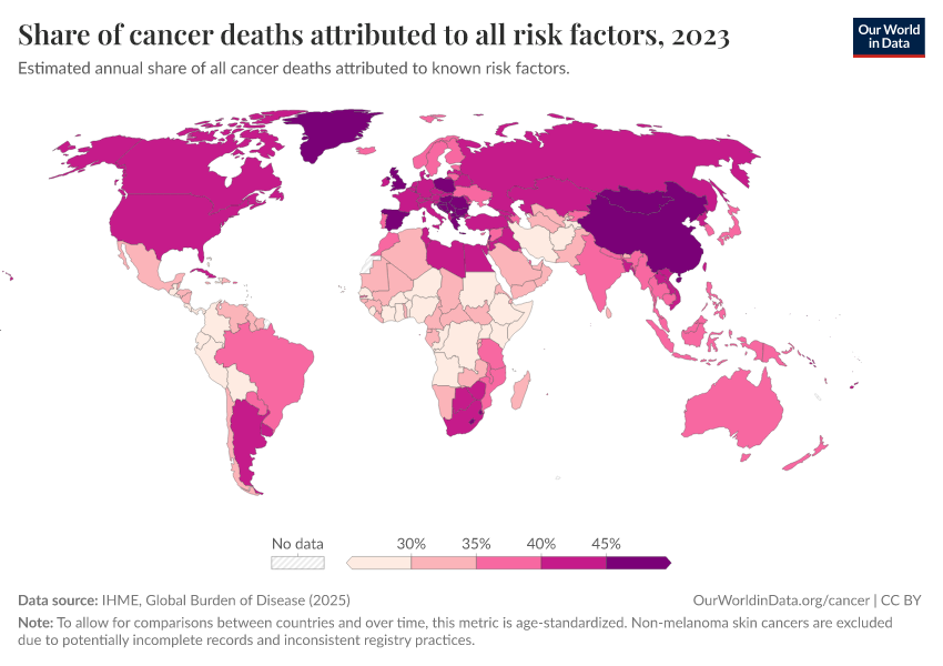 IHME, Global Burden of Disease (2024) – processed by Our World in Data. “Share of cancer deaths attributed to all risk factors” [dataset]. IHME, Global Burden of Disease, “Global Burden of Disease - Risk Factors for Cancer Deaths” [original data]. Retrieved February 12, 2026 from https://pop-growth-BCE.owid.pages.dev:8789/20250909-093708/grapher/share-of-cancer-deaths-attributed-to-all-risk-factors.html (archived on September 9, 2025).