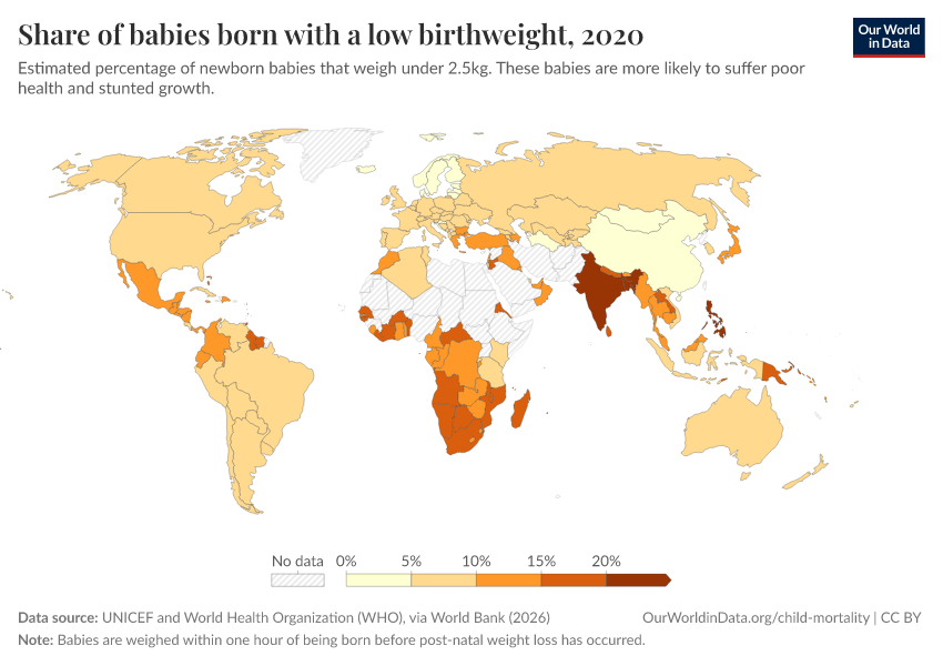 “Data Page: Share of babies born with a low birthweight”. Our World in Data (2026). Data adapted from UNICEF and World Health Organization (WHO), via World Bank. Retrieved from https://pop-growth-BCE.owid.pages.dev:8789/20260112-111535/grapher/share-of-low-birthweight-babies-born.html [online resource] (archived on January 12, 2026).How to cite this data