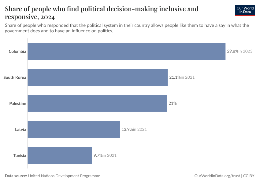United Nations Development Programme – processed by Our World in Data. “Share of people who find political decision-making inclusive and responsive” [dataset]. United Nations Development Programme, “Data from multiple sources” [original data]. Retrieved February 12, 2026 from https://pop-growth-BCE.owid.pages.dev:8789/20251204-144539/grapher/share-of-people-who-find-political-decision-making-inclusive-and-responsive.html (archived on December 4, 2025).