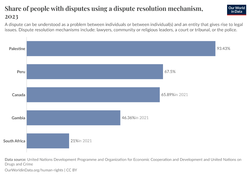 United Nations Development Programme and Organization for Economic Cooperation and Development and United Nations on Drugs and Crime – processed by Our World in Data. “Share of people with disputes using a dispute resolution mechanism” [dataset]. United Nations Development Programme and Organization for Economic Cooperation and Development and United Nations on Drugs and Crime, “Data from multiple sources” [original data]. Retrieved February 12, 2026 from https://pop-growth-BCE.owid.pages.dev:8789/20251204-144539/grapher/share-of-people-with-disputes-using-a-dispute-resolution-mechanism.html (archived on December 4, 2025).