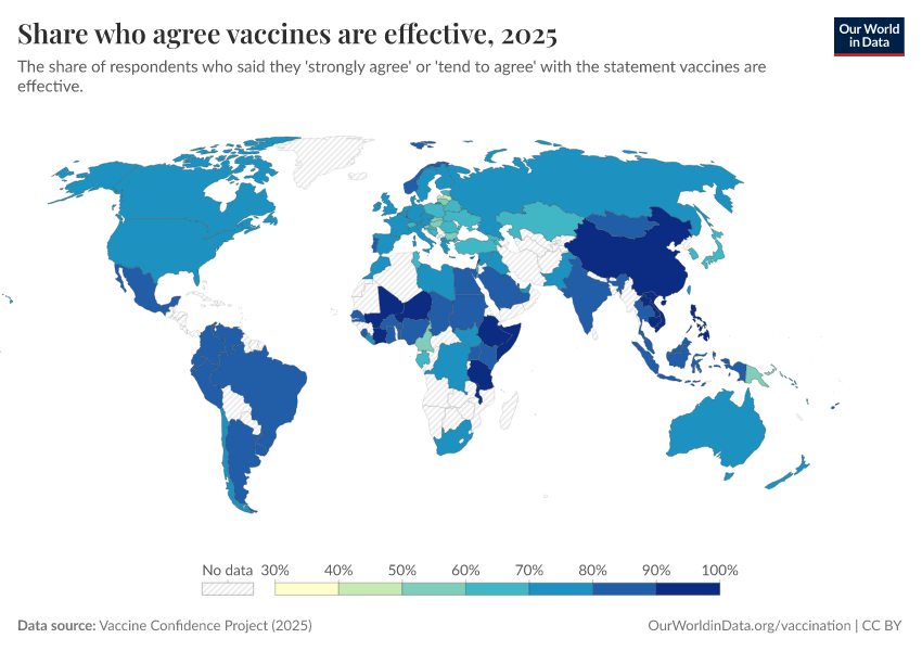 Vaccine Confidence Project (2025) – processed by Our World in Data. “Share who agree vaccines are effective” [dataset]. Vaccine Confidence Project, “Vaccine Confidence Index” [original data]. Retrieved February 12, 2026 from https://pop-growth-BCE.owid.pages.dev:8789/20250909-093708/grapher/share-who-agree-vaccines-are-effective.html (archived on September 9, 2025).