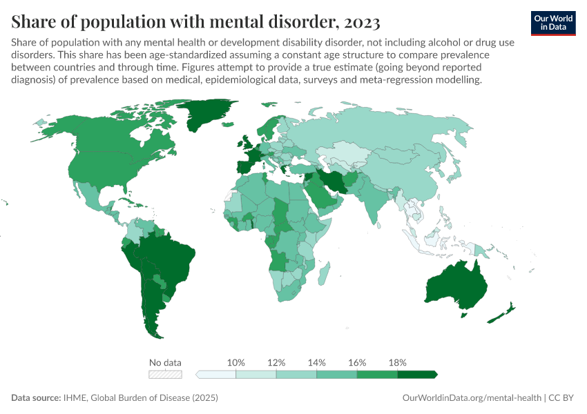 “Data Page: Share of population with mental disorder”, part of the following publication: Saloni Dattani, Lucas Rodés-Guirao, Hannah Ritchie, and Max Roser (2023) - “Mental Health”. Data adapted from IHME, Global Burden of Disease. Retrieved from https://pop-growth-BCE.owid.pages.dev:8789/20250909-093708/grapher/share-with-mental-health-or-development-disorder.html [online resource] (archived on September 9, 2025).How to cite this data